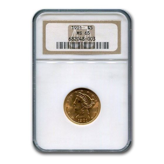 One piece 1901 $5 Liberty Gold Half Eagle MS-65 NGC