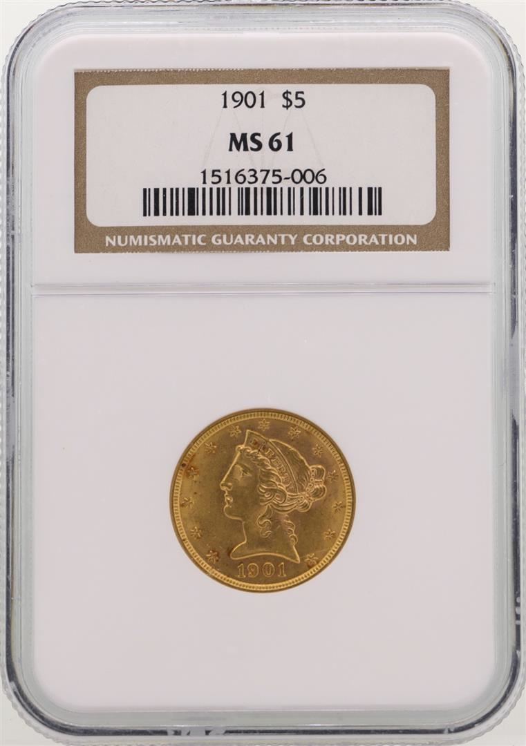 One 1901 $5 Liberty Head Half Eagle Gold Coin NGC MS61. NGC Certified.