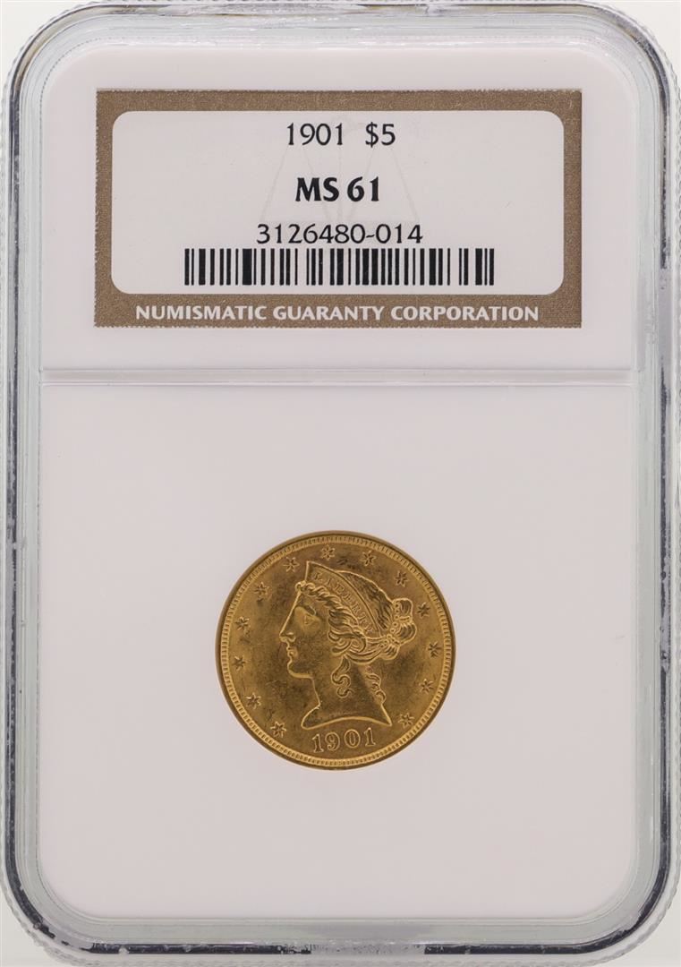 One 1901 $5 Liberty Head Half Eagle Gold Coin NGC MS61. NGC Certified.