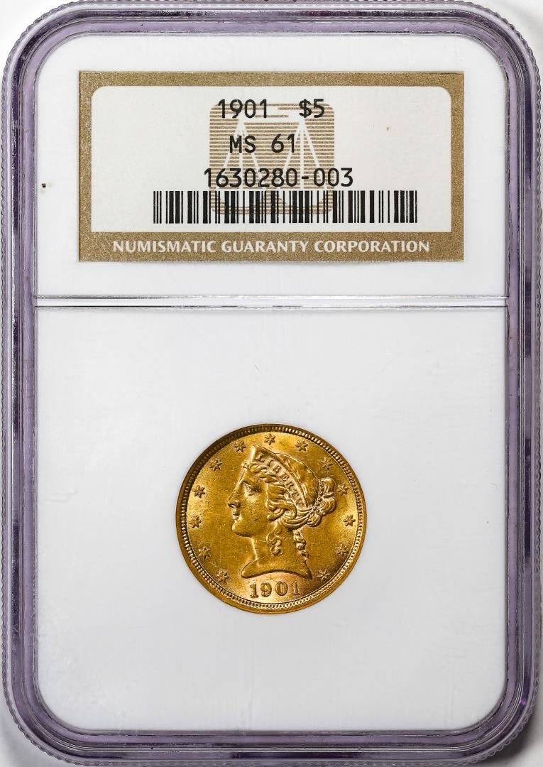 One 1901 $5 Liberty Head Half Eagle Gold Coin NGC MS61. NGC Certified.