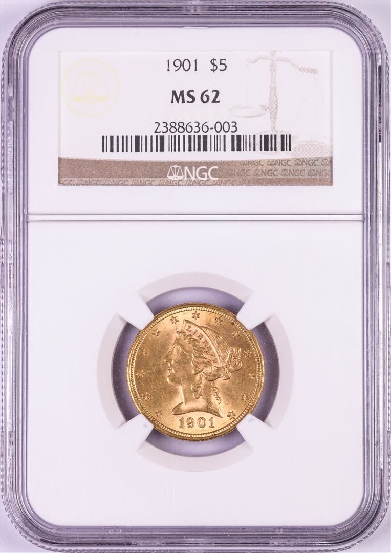 One 1901 $5 Liberty Head Half Eagle Gold Coin NGC MS62. NGC Certified.
