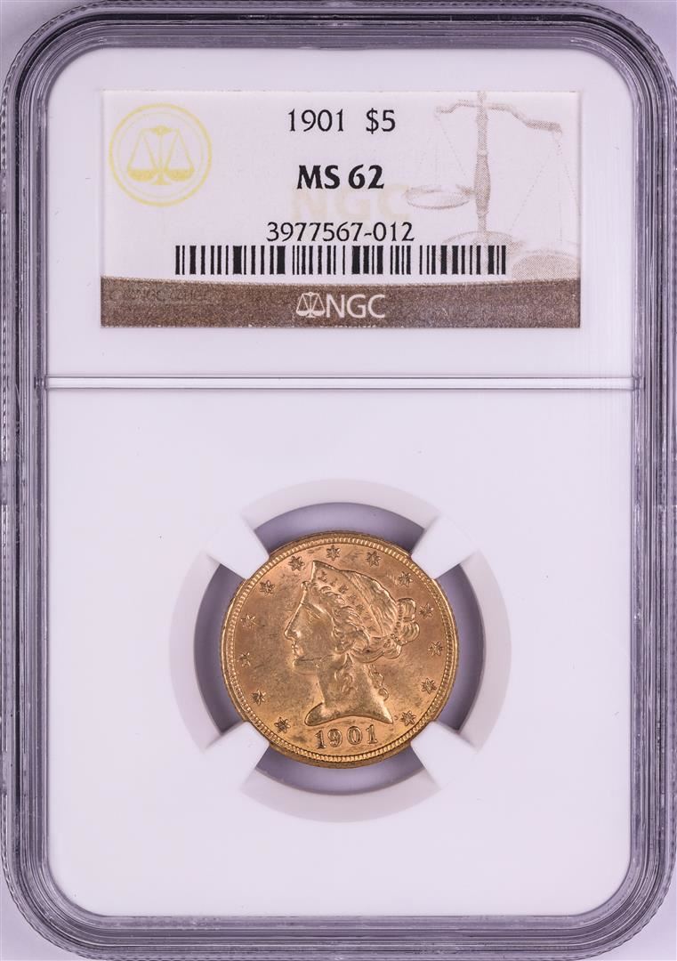 One 1901 $5 Liberty Head Half Eagle Gold Coin NGC MS62. NGC Certified.