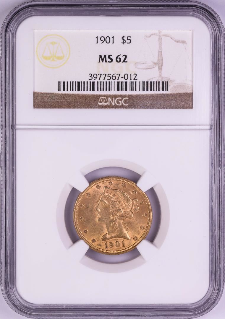 One 1901 $5 Liberty Head Half Eagle Gold Coin NGC MS62. NGC Certified.