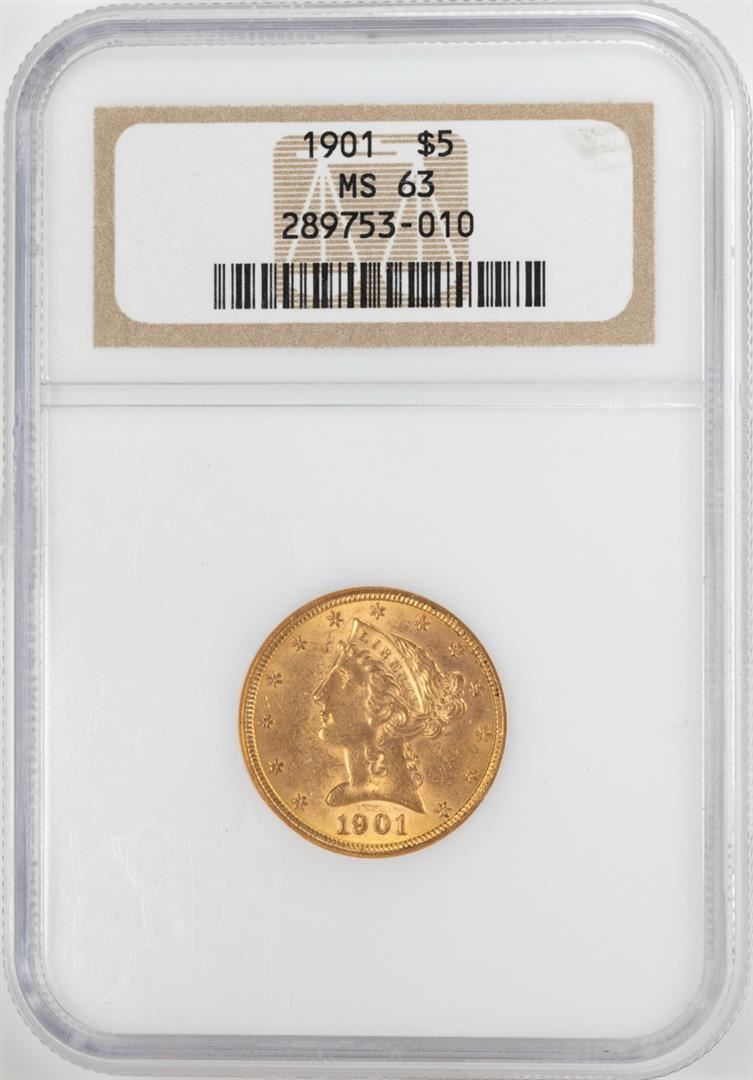 One 1901 $5 Liberty Head Half Eagle Gold Coin NGC MS63. NGC Certified.