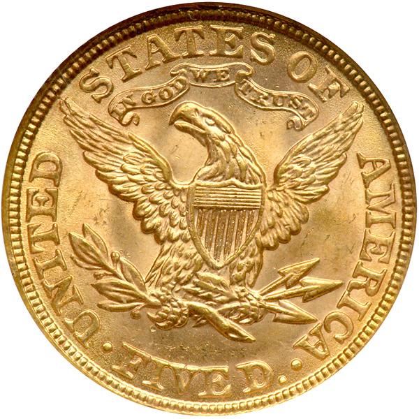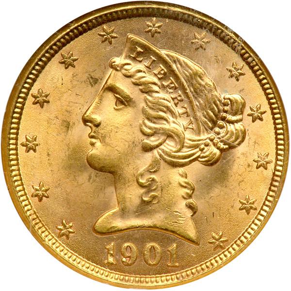 1901 $5 Liberty. NGC graded MS-65. Mainly brilliant. Well struck with smooth, velvety luster and Gem quality on both sides. A great deal of discussion also surrounds a coin's strike. This 1901-P has exceptional detail with no sign of weakness to the curls or at the eagle (PCGS # 8402) .