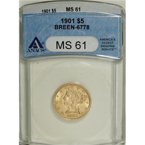 <B>1901 $5 MS61 ANACS.</B></I> Breen-6778. NGC Census: (831/2472). PCGS Population (329/1591). Mintage: 615,900. Numismedia Wsl. Price for NGC/PCGS coin in MS61: $310. (#8402)<BR><BR><B>Coin Engraver:</B> Christian Gobrecht<BR><BR><b>Shipping:</b> Coins & Currency (<a target="_blank" href="http://www.heritageauctions.com/common/shipping.php">view shipping information</a>)