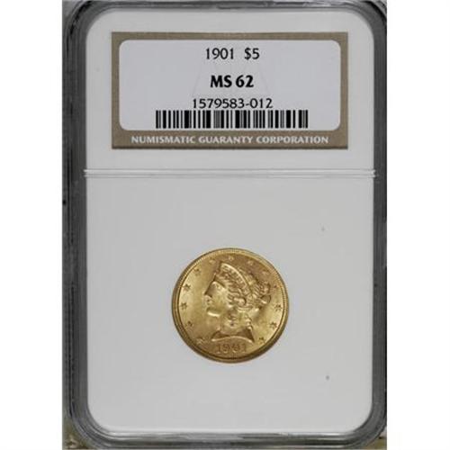 <B>1901 $5 MS62 NGC.</B></I> . NGC Census: (1263/1202). PCGS Population (772/792). Mintage: 615,900. Numismedia Wsl. Price for NGC/PCGS coin in MS62: $325. (#8402)<BR><BR><B>Coin Engraver:</B> Christian Gobrecht<BR><BR><b>Shipping:</b> Coins & Currency (<a target="_blank" href="http://www.heritageauctions.com/common/shipping.php">view shipping information</a>)