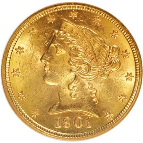 <B>1901 $5 MS63 NGC.</B></I> NGC Census: (631/516). PCGS Population (466/296). Mintage: 615,900. Numismedia Wsl. Price for NGC/PCGS coin in MS63: $665. (#8402)<BR><BR><B>Coin Engraver:</B> Christian Gobrecht<BR><BR><b>Shipping:</b> Coins & Currency (<a target="_blank" href="http://www.heritageauctions.com/common/shipping.php">view shipping information</a>)