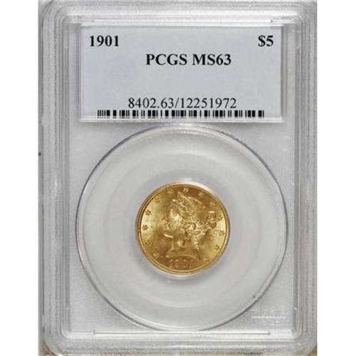 <B>1901 $5 MS63 PCGS.</B></I> . PCGS Population (482/310). NGC Census: (656/544). Mintage: 615,900. Numismedia Wsl. Price for NGC/PCGS coin in MS63: $990. (#8402)<BR><BR><B>Coin Engraver:</B> Christian Gobrecht<BR><BR><b>Shipping:</b> Coins & Currency (<a target="_blank" href="http://www.heritageauctions.com/common/shipping.php">view shipping information</a>)