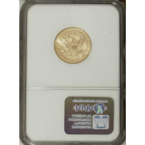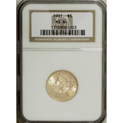 <B>1901 $5 MS64 NGC.</B></I> Satin surfaces of frosted golden color. Some light bagmarks preempt a higher grade. An attractive, eye-appealing example nonetheless. Census: 366 in 64, 123 finer (12/06).<BR><BR><b>Shipping:</b> Coin/Currency (<a target="_blank" href="http://www.heritageauctions.com/common/shipping.php">view shipping information</a>)