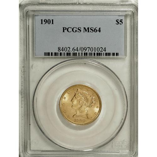 1901 $5 MS64 PCGS. The yellow-gold surfaces are essent