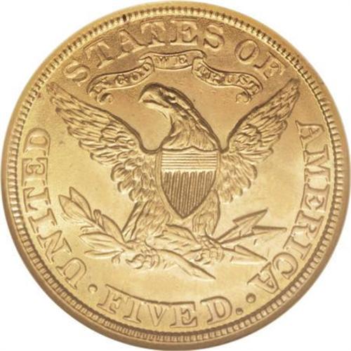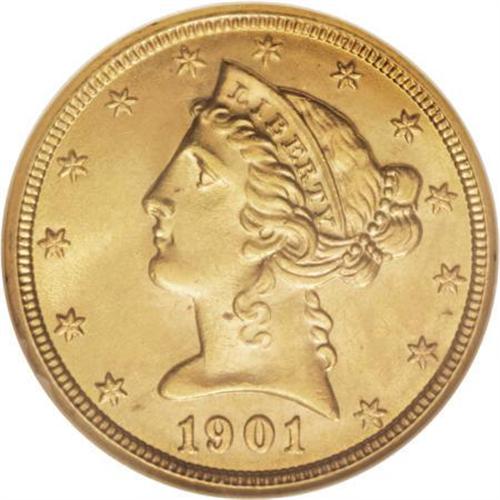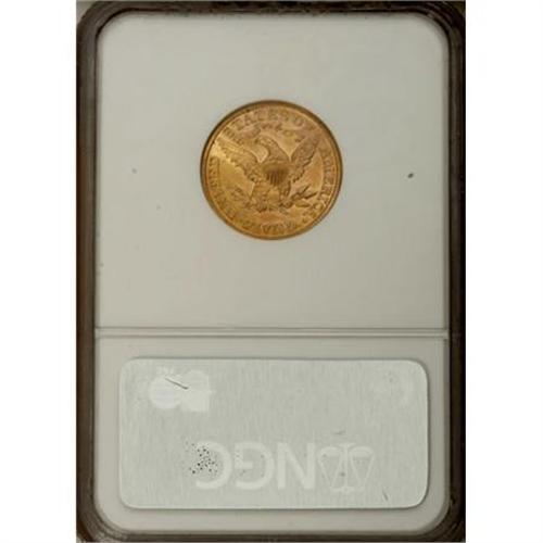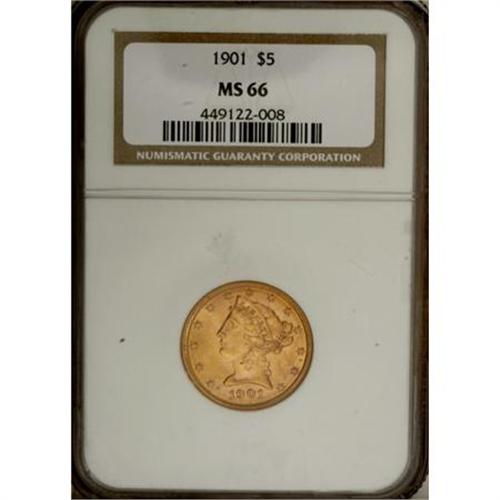 <B>1901 $5 MS66 NGC.</B></I> The softly frosted mint luster and lack of abrasions are significant factors in the overall visual presentation of this coin. However, the unique aspect that sets this piece apart from other 1901 fives is its rich, even, deep red color. This piece really needs to be seen to be fully appreciated. Fully struck also. Census: 23 in 66, 13 finer (11/07).<BR><BR><B>Coin Engraver:</B> Christian Gobrecht<BR><BR><b>Shipping:</b> Coins & Currency (<a target="_blank" href="http://www.heritageauctions.com/common/shipping.php">view shipping information</a>)