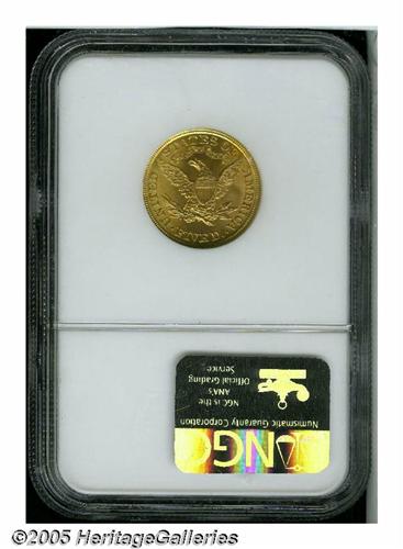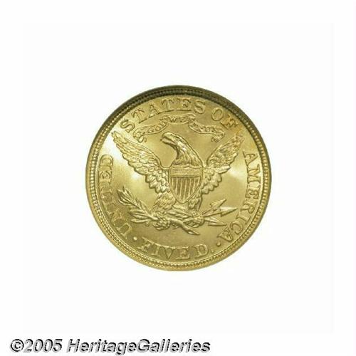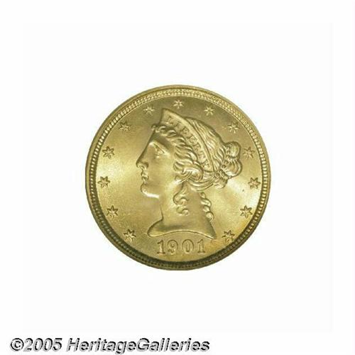 <B>1901<$5> MS67 NGC.</B></I> Take a mental snapshot of the ultimate Liberty Half Eagle. Be sure to include pinpoint sharpness, luxuriant luster, captivating golden-orange color, and, of course, peerless surfaces. Once the picture is developed, it should come very close to matching the Superb 1901 offered here. Hardly a rarity in lesser Uncirculated grades, but a show-stopping beauty this nice. Population: 8 in 67, 0 finer (6/05).