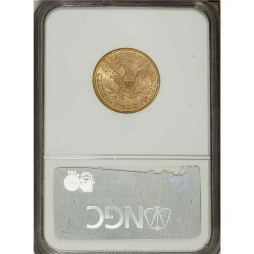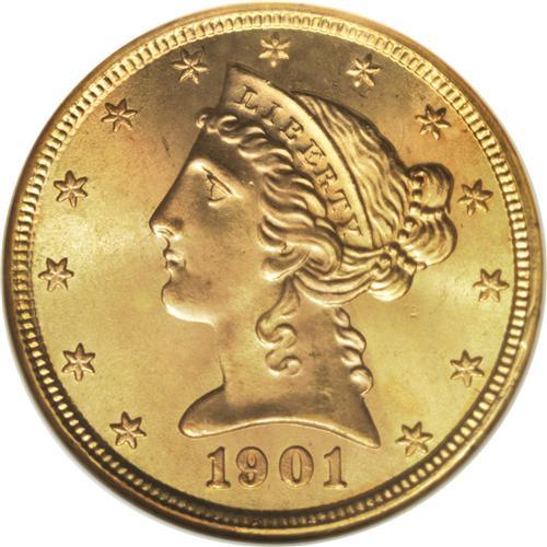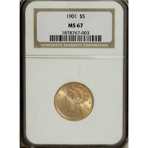<B>1901 $5 MS67 NGC.</B></I> This is a superlative Mint State Liberty half eagle of a quality seldom exceeded. It is tied with several others for the finest example of the date that NGC has certified. In fact, only 16 pieces in the entire series of With Motto Liberty half eagles coined from 1866 to 1908 have been graded higher than this piece by NGC. A frosty example, this Superb Gem piece has rich orange-gold luster on both sides, accented by the slightest pink toning on the obverse. It is sharply struck with essentially full design features on each side. Census: 13 in 67, 0 finer (4/07).<BR><BR><b>Shipping:</b> Coins & Currency (<a target="_blank" href="http://www.heritageauctions.com/common/shipping.php">view shipping information</a>)
