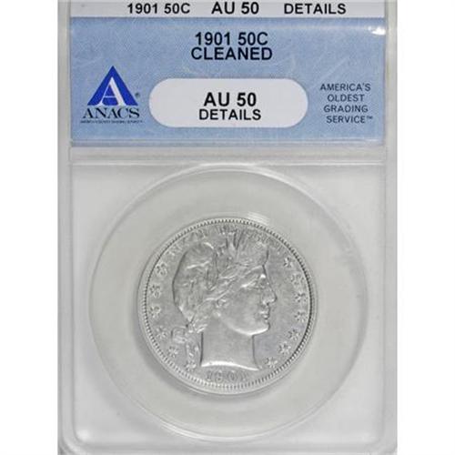 <B>1901 50C --Cleaned--ANACS. AU50 Details.</B></I> NGC Census: (5/165). PCGS Population (17/201). Mintage: 4,268,813. Numismedia Wsl. Price for NGC/PCGS coin in AU50: $242. (#6489)<BR><BR><B>Coin Engraver:</B> Charles E. Barber<BR><BR><b>Shipping:</b> Coins & Currency (<a target="_blank" href="http://www.heritageauctions.com/common/shipping.php">view shipping information</a>)