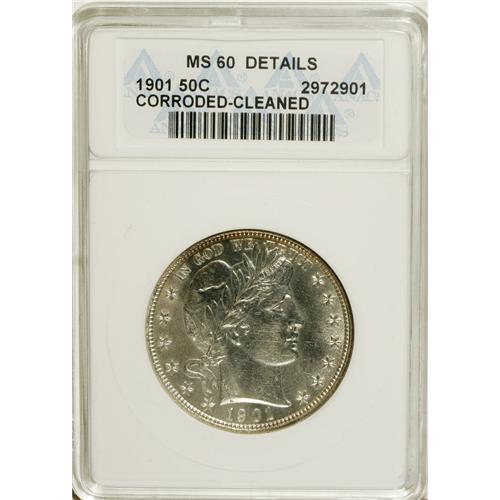 <B>1901 50C --Cleaned, Corroded--ANACS. MS60 Details.</B></I> NGC Census: (4/198). PCGS Population (3/118). Mintage: 4,268,813. Numismedia Wsl. Price for NGC/PCGS coin in MS60: $392. (#6489)<BR><BR><b>Shipping:</b> Coins & Currency (<a target="_blank" href="http://www.heritageauctions.com/common/shipping.php">view shipping information</a>)