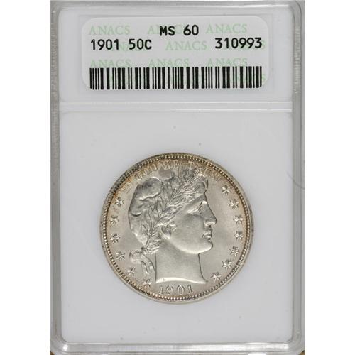 <B>1901 50C MS60 ANACS.</B></I> NGC Census: (4/198). PCGS Population (3/118). Mintage: 4,268,813. Numismedia Wsl. Price for NGC/PCGS coin in MS60: $392. (#6489)<BR><BR><b>Shipping:</b> Coins & Currency (<a target="_blank" href="http://www.heritageauctions.com/common/shipping.php">view shipping information</a>)
