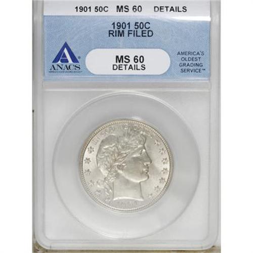 <B>1901 50C --Rim Filed--ANACS. MS60 Details.</B></I> NGC Census: (2/106). PCGS Population (3/124). Mintage: 4,268,813. Numismedia Wsl. Price for NGC/PCGS coin in MS60: $392. (#6489)<BR><BR><B>Coin Engraver:</B> Charles E. Barber<BR><BR><b>Shipping:</b> Coins & Currency (<a target="_blank" href="http://www.heritageauctions.com/common/shipping.php">view shipping information</a>)