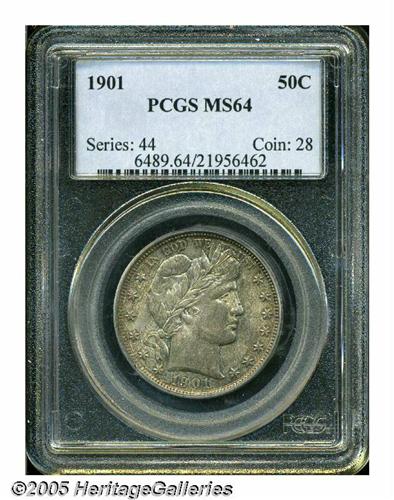 <B>1901<50C> MS64 PCGS.</B></I> A deep layer of speckled, multicolored patina blankets both sides of this well struck, highly lustrous near-Gem. Carefully preserved and mark-free, a conservatively graded near-Gem. Population: 28 in 64, 11 finer (4/05).