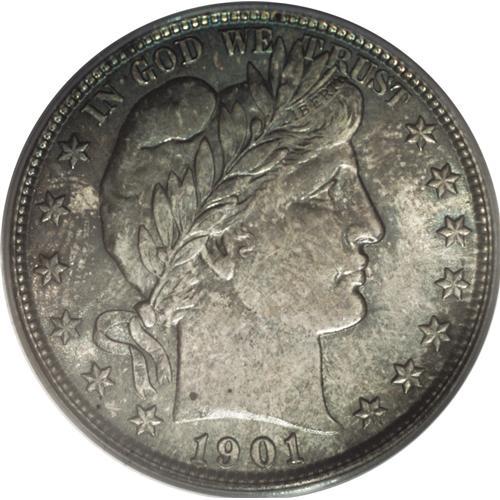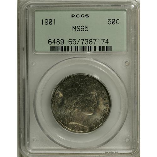 <B>1901 50C MS65 PCGS.</B></I> Radiant cartwheel luster percolates beneath light mint-green and pastel-blue patination on each side. Only light strike softness shows in the usual areas on the reverse, the claws and right (facing) shield corner. A couple of undistracting light abrasions appear on the top of Liberty's cap. Certified in a green-label holder.<BR><BR><b>Shipping:</b> Coin/Currency (<a target="_blank" href="http://www.heritageauctions.com/common/shipping.php">view shipping information</a>)