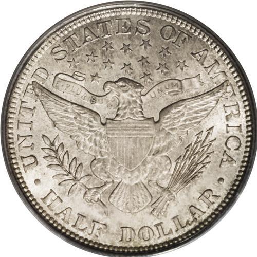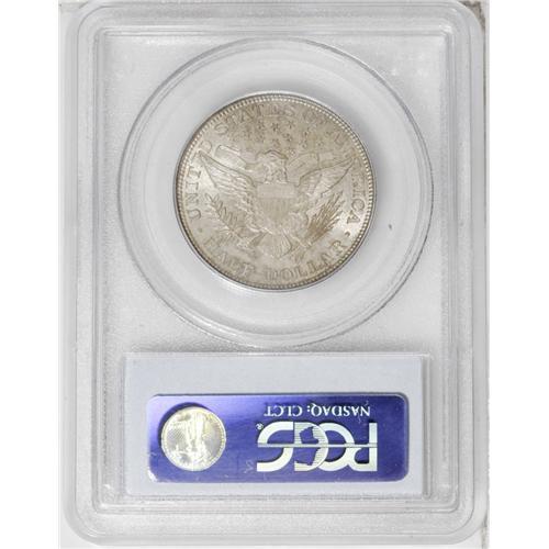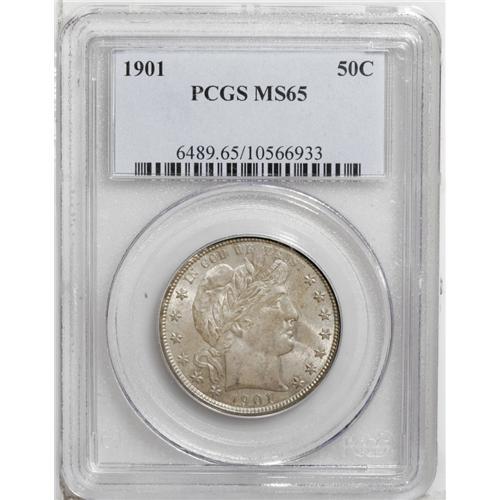 <B>1901<50C> MS65 PCGS.</B></I> The 1901 is one of the surprises in the Barber half series. With a mintage of 4.2 million pieces it should be common in all grades. That is not true, though, in MS65 and better grades. Only five other Gems have been graded by PCGS with five finer (8/06). This is a sharply struck example that is toned in medium density shadings of gray, lilac, and rose. There are no reportable abrasions on either side.