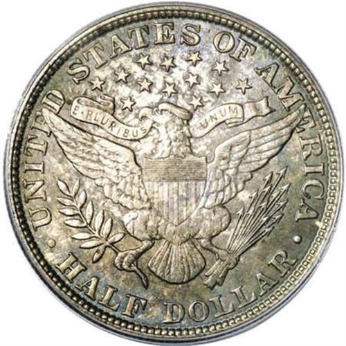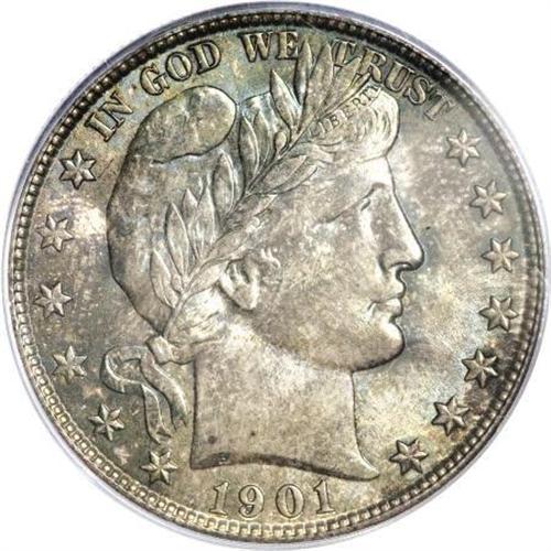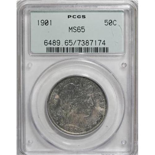 <B>1901 50C MS65 PCGS.</B></I> Radiant cartwheel luster glows beneath deep sea green and pastel-blue patination on each side. Only slight striking softness shows in the usual areas on the reverse, the claws and right (facing) shield corner. A couple of light abrasions appear on the top of Liberty's cap, but these have no effect on the overall appearance or desirability of this Gem. Certified in a green-label holder. Population: 8 in 65, 5 finer (1/08).<BR><BR><B>Coin Engraver:</B> Charles E. Barber<BR><BR><b>Shipping:</b> Coins & Currency (<a target="_blank" href="http://www.heritageauctions.com/common/shipping.php">view shipping information</a>)