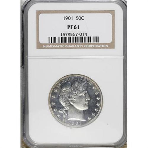<B>1901 50C PR61 NGC.</B></I> . NGC Census: (9/205). PCGS Population (16/186). Mintage: 813. Numismedia Wsl. Price for NGC/PCGS coin in PR61: $433. (#6548)<BR><BR><B>Coin Engraver:</B> Charles E. Barber<BR><BR><b>Shipping:</b> Coins & Currency (<a target="_blank" href="http://www.heritageauctions.com/common/shipping.php">view shipping information</a>)