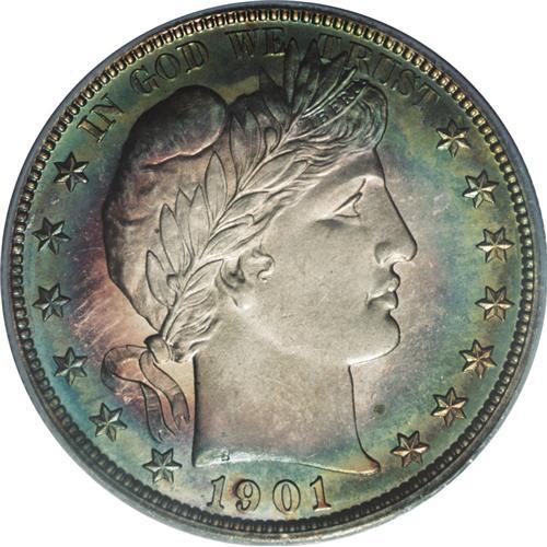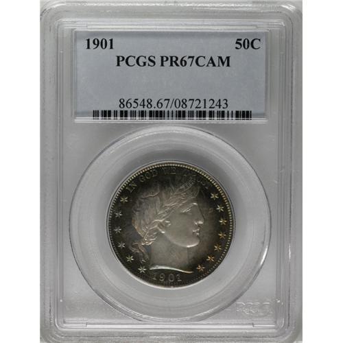 <B>1901 50C PR67 Cameo PCGS.</B></I> This piece is among the finest half-dozen Cameo-designated proof of this issue certified at PCGS (counting resubmissions, as always). Delectable target toning radiates outward from the centers in shades of apricot, mint-green, ice-blue, and lemon-yellow. Under a loupe this sharply struck piece shows one tiny, undistracting contact mark on Liberty's cheek that may have prevented an even finer grade. Population: 6 in 67 Cameo, 0 finer (12/06).<BR><BR><b>Shipping:</b> Coin/Currency (<a target="_blank" href="http://www.heritageauctions.com/common/shipping.php">view shipping information</a>)
