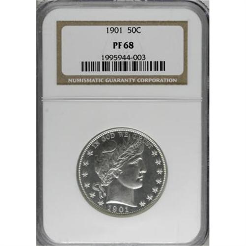 <B>1901 50C PR68 NGC.</B></I> A large number of 1901 proof half dollars (813-piece mintage) have crossed the grading desks of NGC and PCGS, actually about 400 coins, mostly in the PR62 to PR66 range. At the lofty level of PR68, however, the issue is quite elusive, as fewer than 10 pieces have been seen.<BR> The bright, untoned PR68 coin in this lot exhibits sharply impressed devices, except for a hint of the usual softness at the upper right corner of the shield, where there are also some faint roller marks. Strong magnification reveals the surfaces to be near pristine, as there are no blemishes that we can even identify as pedigree markers. Census: 7 in 68, 0 finer (7/07).<BR><BR><B>Coin Engraver:</B> Charles E. Barber<BR><BR><b>Shipping:</b> Coins & Currency (<a target="_blank" href="http://www.heritageauctions.com/common/shipping.php">view shipping information</a>\)