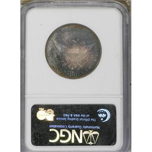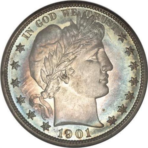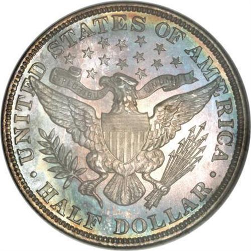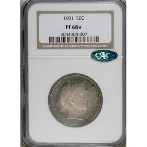 <B>1901 50C PR68 <img src="/images/star.gif" width="10" height="10" alt="" border="0"> NGC. CAC.</B></I> Remarkable lime-green, gold, forest-green, apricot, and cherry-wine toning endows this virtually immaculate Superb Gem. The strike is precise, with only trivial inexactness on the plumage near the upper right shield corner. The original proof mintage was only 813 pieces, and only a handful of survivors can compare with the eye appeal of the present example. A small and unobtrusive spot rests between the neck and star 13. Those assembling gorgeously toned silver type sets should consider the present opportunity. Census: 8 in 68, 0 finer (1/08).<BR><BR><B>Coin Engraver:</B> Charles E. Barber<BR><BR><b>Shipping:</b> Coins & Currency (<a target="_blank" href="http://www.heritageauctions.com/common/shipping.php">view shipping information</a>)