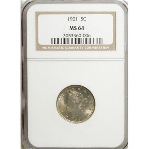 <B>1901 5C MS64 NGC.</B></I> NGC Census: (226/190). PCGS Population (251/217). Mintage: 26,480,212. Numismedia Wsl. Price for NGC/PCGS coin in MS64: $200. (#3862)<BR><BR><B>Coin Engraver:</B> Charles E. Barber<BR><BR><b>Shipping:</b> Coins & Currency (<a target="_blank" href="http://www.heritageauctions.com/common/shipping.php">view shipping information</a>)