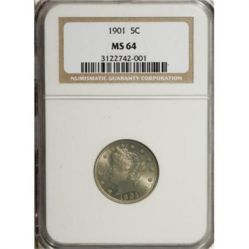 <B>1901 5C MS64 NGC.</B></I> NGC Census: (229/193). PCGS Population (254/220). Mintage: 26,480,212. Numismedia Wsl. Price for NGC/PCGS coin in MS64: $200. (#3862)<BR><BR><B>Coin Engraver:</B> Charles E. Barber<BR><BR><b>Shipping:</b> Coins & Currency (<a target="_blank" href="http://www.heritageauctions.com/common/shipping.php">view shipping information</a>)