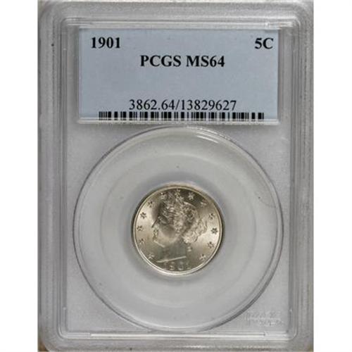 <B>1901 5C MS64 PCGS.</B></I> PCGS Population (241/190). NGC Census: (223/193). Mintage: 26,480,212. Numismedia Wsl. Price for NGC/PCGS coin in MS64: $200. (#3862)<BR><BR><B>Coin Engraver:</B> Charles E. Barber<BR><BR><b>Shipping:</b> Coins & Currency (<a target="_blank" href="http://www.heritageauctions.com/common/shipping.php">view shipping information</a>\)