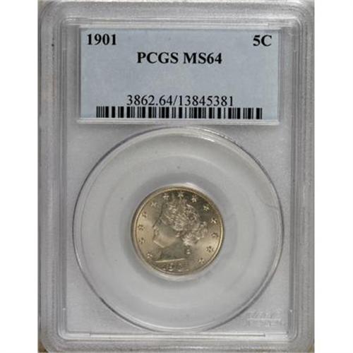 <B>1901 5C MS64 PCGS.</B></I> PCGS Population (245/193). NGC Census: (224/195). Mintage: 26,480,212. Numismedia Wsl. Price for NGC/PCGS coin in MS64: $200. (#3862)<BR><BR><B>Coin Engraver:</B> Charles E. Barber<BR><BR><b>Shipping:</b> Coins & Currency (<a target="_blank" href="http://www.heritageauctions.com/common/shipping.php">view shipping information</a>)