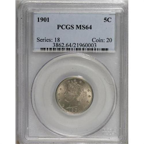 <B>1901 5C MS64 PCGS.</B></I> PCGS Population (249/202). NGC Census: (225/196). Mintage: 26,480,212. Numismedia Wsl. Price for NGC/PCGS coin in MS64: $200. (#3862)<BR><BR><B>Coin Engraver:</B> Charles E. Barber<BR><BR><b>Shipping:</b> Coins & Currency (<a target="_blank" href="http://www.heritageauctions.com/common/shipping.php">view shipping information</a>)