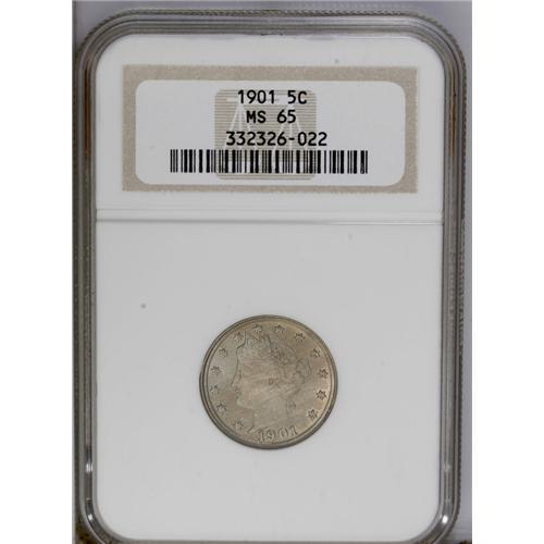 <B>1901<5C> MS65 NGC.</B></I> A lovely Gem with rich gold toning over frosty gray surfaces. Both sides are highly lustrous and quite well struck, although the lower part of the wreath is a bit indistinct.