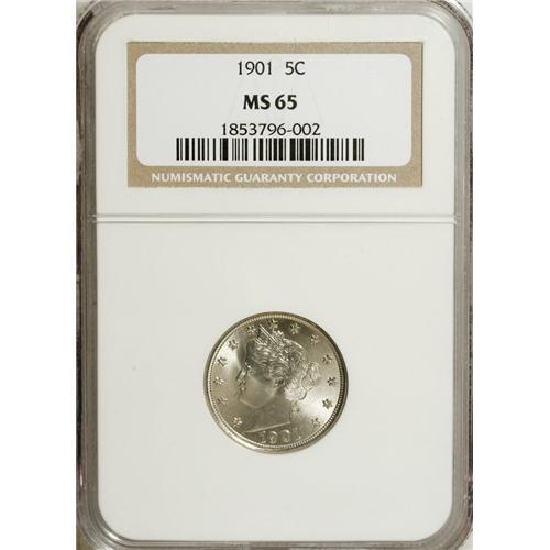 <B>1901 5C MS65 NGC.</B></I> NGC Census: (156/35). PCGS Population (147/35). Mintage: 26,480,212. Numismedia Wsl. Price for NGC/PCGS coin in MS65: $560. (#3862)<BR><BR><b>Shipping:</b> Coins & Currency (<a target="_blank" href="http://www.heritageauctions.com/common/shipping.php">view shipping information</a>)