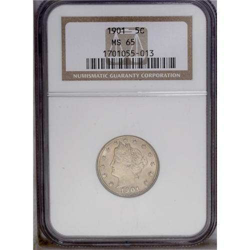 <B>1901 5C MS65 NGC.</B></I> Pastel sky-blue and apricot tints provide exceptional eye appeal. Thoroughly lustrous, and the strike is pleasing save for the customary softness on the left ear of corn.