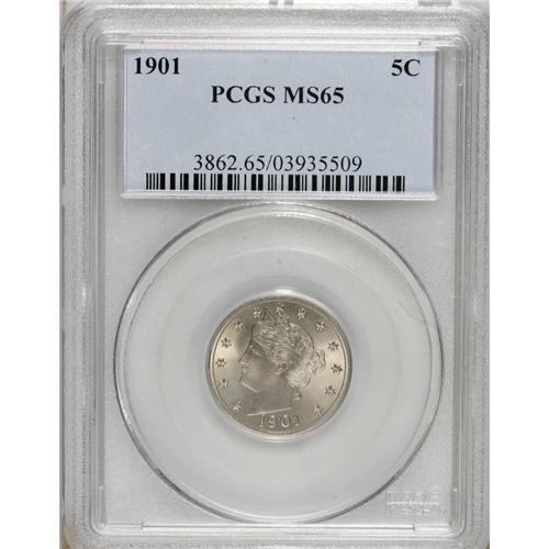 <B>1901 5C MS65 PCGS.</B></I> Chestnut-tan and sea-green blend throughout this vigorously lustrous Gem. A beautifully preserved example with above average sharpness on the left ear of corn and the forehead curls.<BR><BR><b>Shipping:</b> Coins & Currency (<a target="_blank" href="http://www.heritageauctions.com/common/shipping.php">view shipping information</a>)
