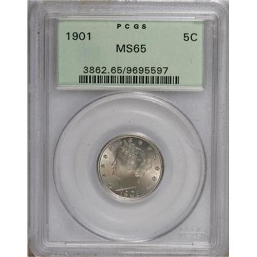 <B>1901 5C MS65 PCGS.</B></I> PCGS Population (153/37). NGC Census: (156/37). Mintage: 26,480,212. Numismedia Wsl. Price for NGC/PCGS coin in MS65: $585. (#3862)<BR><BR><B>Coin Engraver:</B> Charles E. Barber<BR><BR><b>Shipping:</b> Coins & Currency (<a target="_blank" href="http://www.heritageauctions.com/common/shipping.php">view shipping information</a>\)