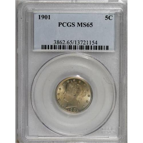 <B>1901 5C MS65 PCGS.</B></I> Effusive periwinkle-blue, olive, and mint shades are the prime attraction of this turn-of-the-century Gem. Though well-preserved with excellent central detail, the piece shows a touch of softness on the obverse stars.<BR><BR><B>Coin Engraver:</B> Charles E. Barber<BR><BR><b>Shipping:</b> Coins & Currency (<a target="_blank" href="http://www.heritageauctions.com/common/shipping.php">view shipping information</a>)
