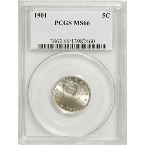 <B>1901 5C MS66 PCGS.</B></I> A shining representative of this first 20th century nickel issue, well-defined in the centers but with a touch of softness on the stars and lower wreath. PCGS has graded only one finer example (9/07).<BR><BR><B>Coin Engraver:</B> Charles E. Barber<BR><BR><b>Shipping:</b> Coins & Currency (<a target="_blank" href="http://www.heritageauctions.com/common/shipping.php">view shipping information</a>)