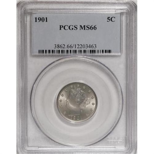<B>1901 5C MS66 PCGS.</B></I> Excellent definition on the portrait, though the peripheral elements are a touch soft. Gold and blue accents visit otherwise nickel-gray surfaces on this turn-of-the-century Premium Gem.<BR><I>From The John Stimson, Sr. Collection, Part Two.</B></I><BR><BR><B>Coin Engraver:</B> Charles E. Barber<BR><BR><b>Shipping:</b> Coins & Currency (<a target="_blank" href="http://www.heritageauctions.com/common/shipping.php">view shipping information</a>)