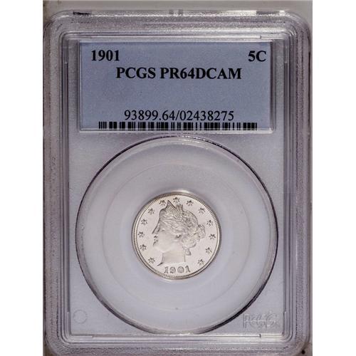 <B>1901<5C> PR64 Deep Cameo PCGS.</B></I> This needle-sharp near-Gem displays impressive mint frost throughout the devices. Even Liberty's cheek and neck are radiant. Prominently mirrored fields are only faintly toned. Population: 2 in 64 Deep Cameo, 2 finer (3/06).