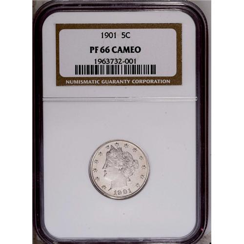 <B>1901<5C> PR66 Cameo NGC.</B></I> This exquisitely struck Premium Gem is untoned aside from a few faint gray flecks on the lower right obverse. Flashy fields and snow-white devices confirm the eye appeal. Census: 6 in 66 Cameo, 6 finer (2/06).