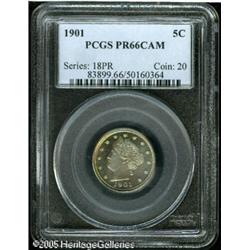 <B>1901 5C PR66 Cameo PCGS.</B></I> Splashes of powder-blue, yellow-gold, and lilac patina. Adequately struck on the motifs. Population: 14 in 66, 5 finer (1/05). Lot:5934
