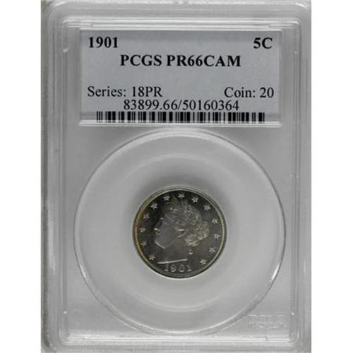 <B>1901 5C PR66 Cameo PCGS.</B></I> Splashes of powder-blue, yellow-gold, and lilac patina add color to this early 20th century proof. Solidly struck on the devices with slightly above-average contrast for this copper-nickel series. Population: 9 in 66 Cameo, 6 finer (6/07).<BR><BR><b>Shipping:</b> Coins & Currency (<a target="_blank" href="http://www.heritageauctions.com/common/shipping.php">view shipping information</a>\)