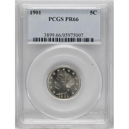 <B>1901 5C PR66 PCGS.</B></I> This is a bright, beautiful Premium Gem proof, with splendidly defined motifs and impressive, near-pristine surfaces. Faint die lines are noted on Liberty's neck and jaw.<BR><BR><b>Shipping:</b> Coins & Currency (<a target="_blank" href="http://www.heritageauctions.com/common/shipping.php">view shipping information</a>)