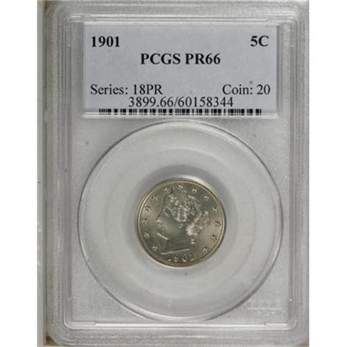 <B>1901 5C PR66 PCGS.</B></I> PCGS Population (81/23). NGC Census: (107/30). Mintage: 1,985. Numismedia Wsl. Price for NGC/PCGS coin in PR66: $700. (#3899)<BR><BR><B>Coin Engraver:</B> Charles E. Barber<BR><BR><b>Shipping:</b> Coins & Currency (<a target="_blank" href="http://www.heritageauctions.com/common/shipping.php">view shipping information</a>)