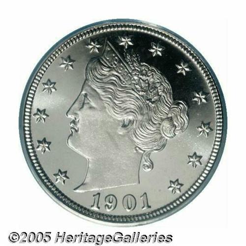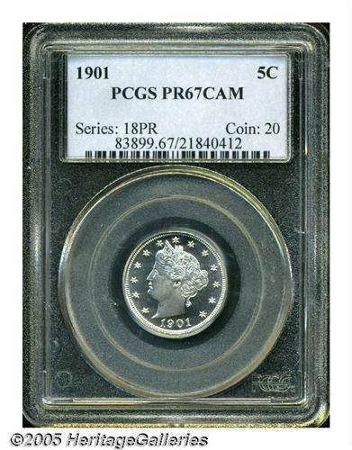 <B>1901<5C> PR67 Cameo PCGS.</B></I> A splendid cameoed specimen that is untoned and offers remarkable quality and eye appeal. The fields are exceptionally deep in their mirrored reflectivity, with appreciable frost visible on the devices. Population: 6 in 67, 0 finer (4/05).